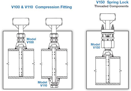 • Single or double supports, compression fitting, spring lock, hot tap – threaded or flanged and flanged connections available